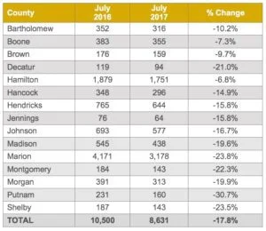 - Hendricks County showed significant growth in homes sold, a 21 percent increase in July 2017 compared to July 2016. Morgan County followed closely behind with a 16.9 percent increase in sales.